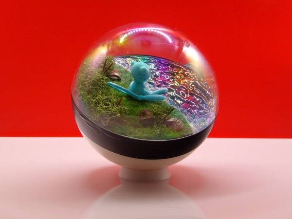 Légendaire, rare et auréolé de mystère, Mew shiny se dévoile ici dans une scène empreinte de sérénité. Lovée au cœur d’une Pokéball de collection, cette créature mythique resplendit dans un décor inspiré de la nature, entre verdure délicate et bordure d’eau scintillante.