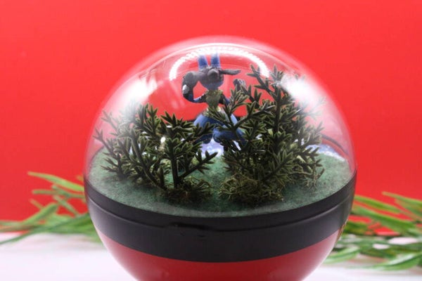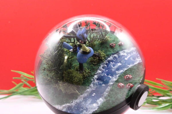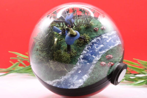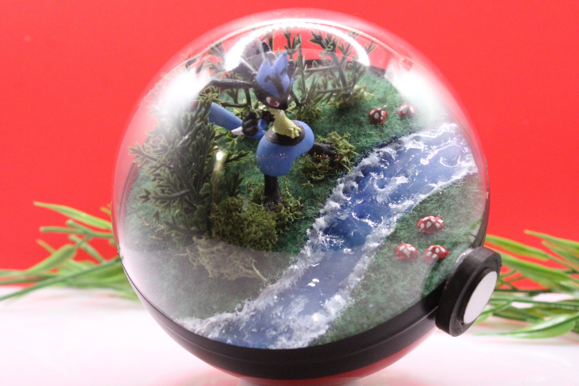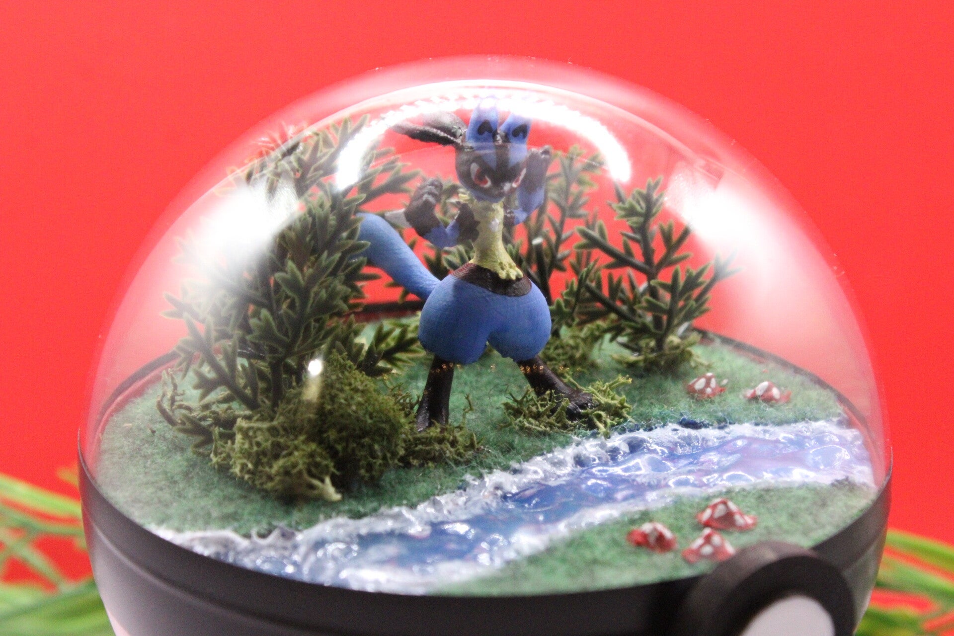 Dans cette scène miniature enfermée dans une sphère rappelant une célèbre capsule rouge et blanche, on découvre un combattant canin bipède, connu pour maîtriser l’aura et pour son mélange d’agilité et de puissance. Sa silhouette élancée, son museau allongé, ses oreilles pointues et les pics qu’il porte sur les mains et la poitrine le rendent immédiatement reconnaissable pour les connaisseurs. Peint à la main, il se tient en garde au bord d’un petit ruisseau, entouré d’une végétation dense qui met parfaitement en valeur son allure déterminée.