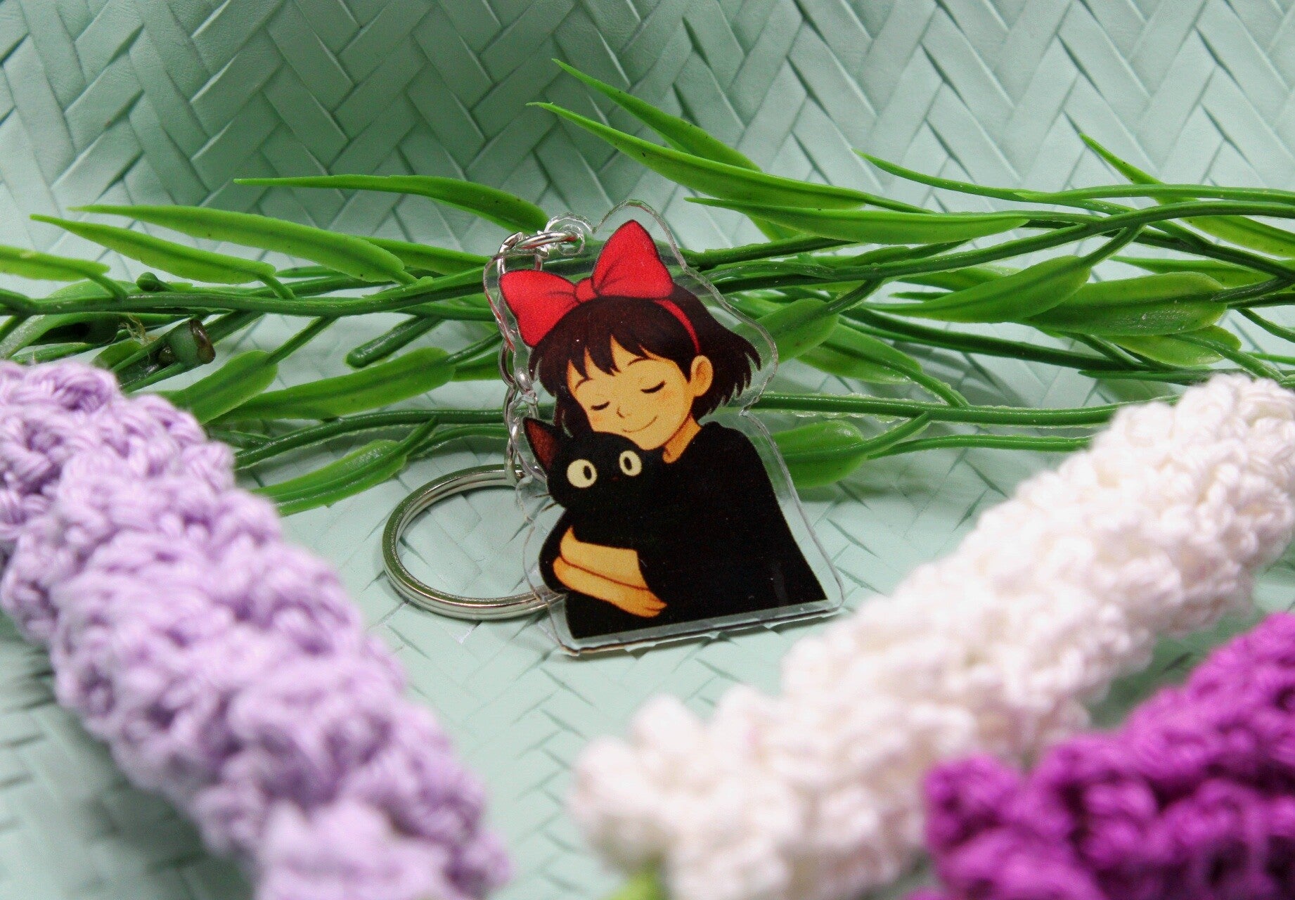 Un porte-clé en plastique mettant en scène une jeune fille coiffée d’un grand nœud rouge, tenant dans ses bras son fidèle chat noir aux yeux ronds. Une illustration douce et nostalgique inspirée d’un film culte mettant en scène une apprentie livreuse qui parcourt les toits en balai. Dessin fait à la main puis imprimé, avec anneau en acier. Dimensions : 5 cm x 3 cm.