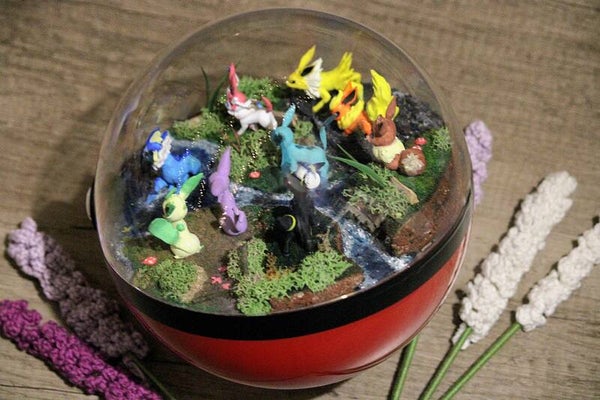 - Neuf figurines (Évoli + 8 évolutions) en plastique, issues d’une impression 3D et peintes à la main